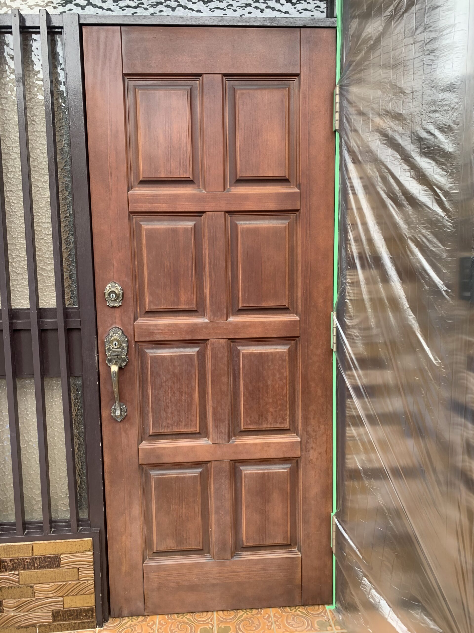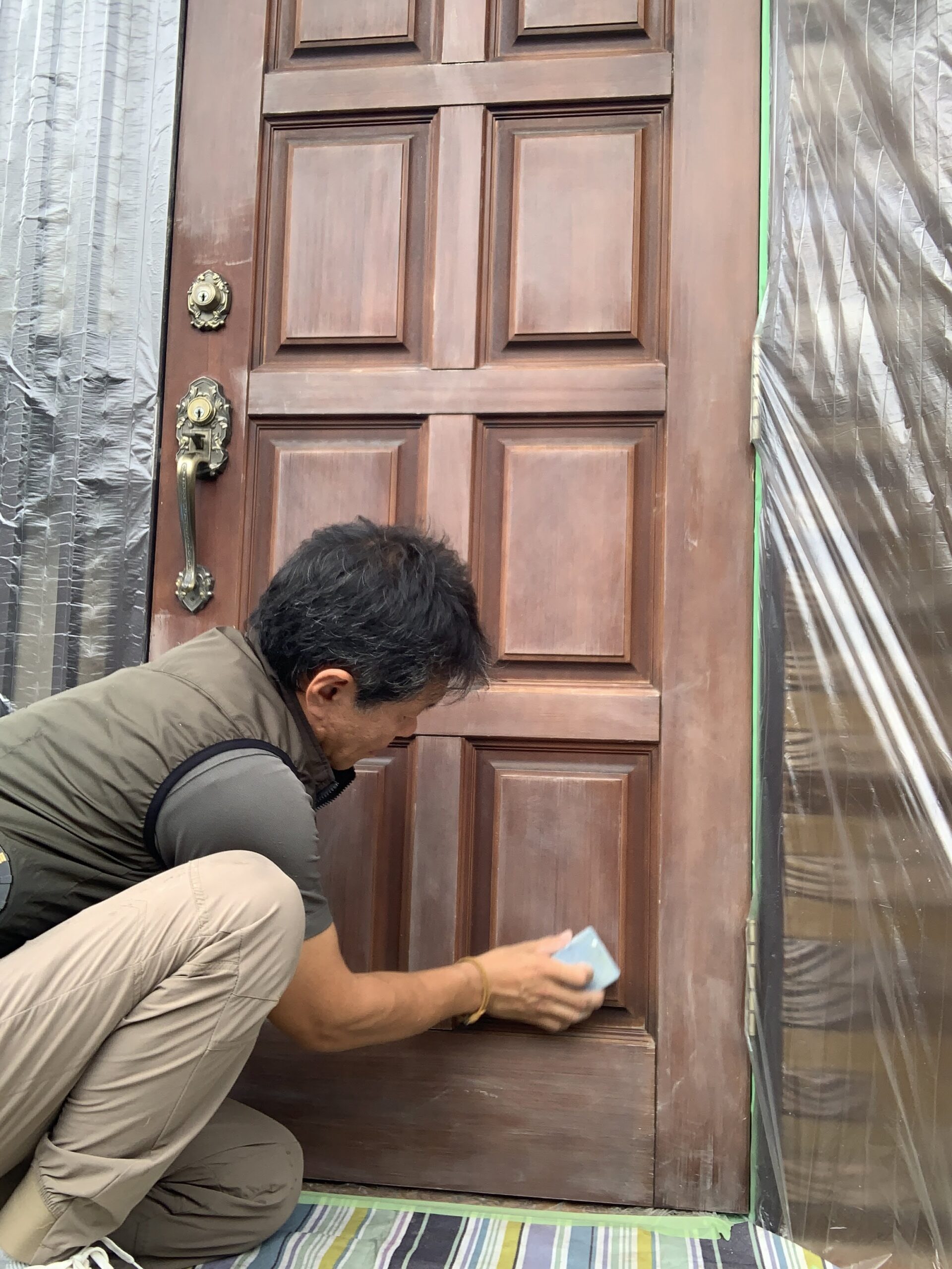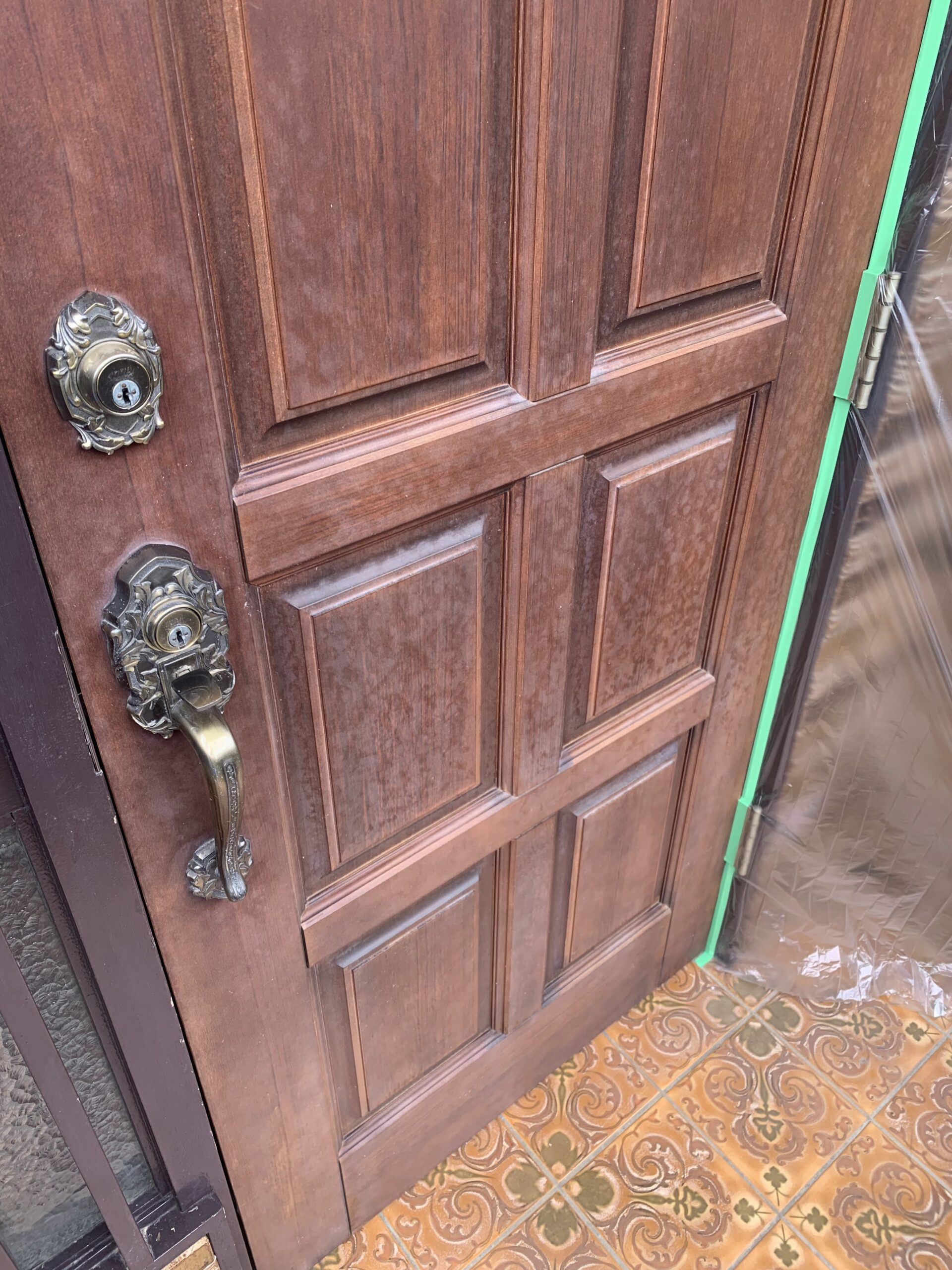 日焼けして知らっちゃけてしまった玄関塗装のご依頼を頂きました。 状況はクリア層(ニス)の経年劣化。今回は色は入れなくて良いとの事で、クリア層の復元塗装を行いました。塗装は気温や湿度、風も影響します。天気も良く風も無かったので、ベストコンディション作業が出来ました!