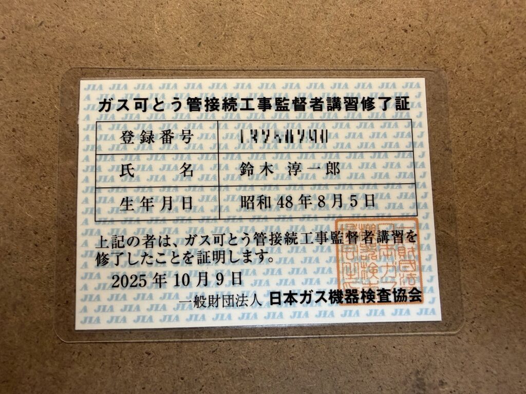 ガス可とう管接続工事監督者講習を受講致しました! 電気工事士は取得済なので、給湯器の交換やビルトインガスコンロの交換、IHクッキングヒーターへの変更工事も出来るようになりました!